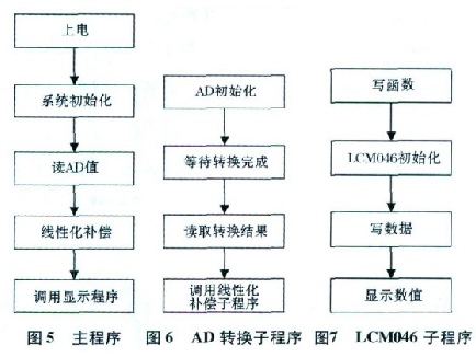 軟件設計主要包括A /D 轉換程序和LCM 046 數(shù)據(jù)顯示兩部分。另外還有非線性補償部分, 在線性不好的情況下可以采用插值法進行必要的線性補償。軟件流程圖設計如圖5、圖6、圖7所示。