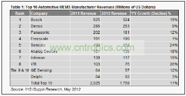 據(jù)IHS iSuppli公司的汽車MEMS報(bào)告,德國(guó)博世2011年是全球最大的汽車MEMS器件生產(chǎn)商,憑借自己的優(yōu)勢(shì)地位和高于產(chǎn)業(yè)平均水平的增長(zhǎng)速度,其營(yíng)業(yè)收入實(shí)現(xiàn)增長(zhǎng)。