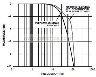 確定傳感器步進(jìn)響應(yīng)對于隔離在確定帶寬特性時(shí)觀察到的諧振條件很有用。圖1所示為一種采用ADIS16080的系統(tǒng)的頻率響應(yīng)。圖中所示諧振頻率為100 Hz。開始時(shí),該諧振到底是傳感器行為導(dǎo)致,還是系統(tǒng)中的機(jī)械諧振所導(dǎo)致,這并不清楚。幸運(yùn)的是,步進(jìn)響應(yīng)(如自測功能所確定)可以區(qū)分這兩種效應(yīng)。圖2顯示了兩種條件下的坐標(biāo)曲線圖:測試設(shè)置導(dǎo)致的諧振和傳感器本身導(dǎo)致的諧振。