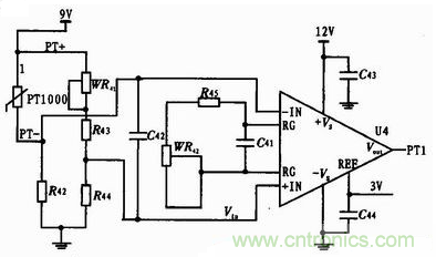 圖4中WR41是調(diào)零電位器;電橋的輸出直接連接運(yùn)放AD623,其連接和調(diào)節(jié)增益方法和上節(jié)中相同這里不再介紹。調(diào)試時(shí)PT1000用電阻箱實(shí)現(xiàn)的,阻值由分度表獲得的。