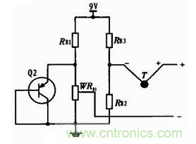 本設(shè)計(jì)采用晶體管PN結(jié)溫度特性進(jìn)行冷端補(bǔ)償,冷端補(bǔ)償電路和熱電偶串聯(lián),如圖5所示。圖中T為熱電偶,其他為冷端補(bǔ)償電路,晶體管選用三極管9012,其電壓溫度變化率約為-2.1 mV/℃,3個(gè)電阻、電位器和PNP三極管組成電橋。當(dāng)冷端溫度升高時(shí),PN結(jié)壓降降低,WR81滑動(dòng)頭電勢(shì)降低,WR82和R83中間電勢(shì)不變,電橋輸出增大,補(bǔ)償了熱電偶冷端的溫漂,當(dāng)溫度降低則相反。電路的輸出直接連在運(yùn)放AD623的輸入端。