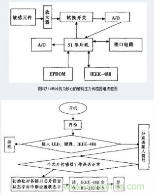 總體結(jié)構(gòu)設(shè)計。半導(dǎo)體敏元件、放大器、轉(zhuǎn)換開關(guān)、雙積分A/D轉(zhuǎn)換器、單片機、接口電路、IEEE~488標(biāo)準(zhǔn)接口、存儲器以及部分外圍電路組合在一起形成了智能壓力傳感器。
