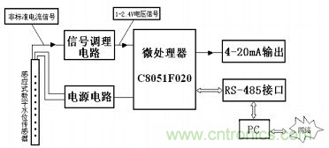 本系統(tǒng)采用C8051F020單片機(jī)為核心處理器件,把經(jīng)過調(diào)理電路處理的感應(yīng)式數(shù)字傳感器的電流信號(hào)經(jīng)模數(shù)轉(zhuǎn)換數(shù)字化,存入單片機(jī)內(nèi)部存儲(chǔ)器,并轉(zhuǎn)化為16位的數(shù)字信號(hào),一路送AD421轉(zhuǎn)化為4~20 mA標(biāo)準(zhǔn)電流信號(hào),進(jìn)行傳輸或控制;另外一路通過MAX485,在上位機(jī)查詢命令到達(dá)的時(shí)候發(fā)送上位機(jī),實(shí)現(xiàn)實(shí)時(shí)的監(jiān)控。本傳感器變送器系統(tǒng)軟件包括以下幾個(gè)部分:主程序、AD采集子程序、數(shù)據(jù)處理子程序、AD421轉(zhuǎn)化子程序、MAX485通信子程序,另外,根據(jù)需要可以加入報(bào)警子程序和其他的輔助程序等。整個(gè)系統(tǒng)如圖5所示。