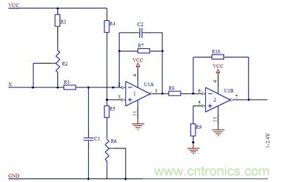 信號(hào)調(diào)理電路中還設(shè)計(jì)濾波電路,是為了濾去測(cè)量現(xiàn)場(chǎng)的干擾,例如電氣干擾、電磁干擾,使系統(tǒng)的信噪比增加。如圖2所示,電阻R2和電容C1組成簡(jiǎn)單的無源RC低通濾波器。電阻R3、R7,電容C2及運(yùn)放組成一階反相輸入RC有源低通濾波器,有源濾波器比無源濾波器具有更優(yōu)越的性能,提高了頻率特性值,改善了選擇性。