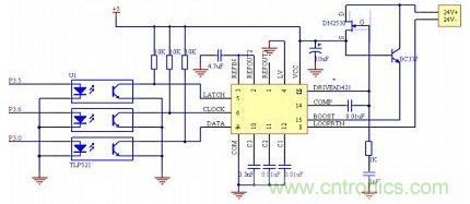 AD421是ADI公司推出的一款單片高性能數(shù)模轉(zhuǎn)換器(DAC)。它由16位數(shù)字信號(hào)以串行方式輸入,4~20 mA電流輸出,在智能儀表方面應(yīng)用廣泛。AD421與單片機(jī)的連接主要有串行數(shù)據(jù)輸入端和控制端,在時(shí)鐘CLOCK作用下,輸入移位寄存器把DATA引腳上的數(shù)據(jù)逐位讀入,LATCH鎖存脈沖把寄存器中的數(shù)據(jù)鎖存到DAC中。根據(jù)其工作原理,AD421與C8051F020芯片的接口電路如圖3所示。AD421的數(shù)據(jù)接口和單片機(jī)P3.0口相連,用來接收16位的串行數(shù)據(jù)。單片機(jī)P3.6口用來產(chǎn)生時(shí)鐘信號(hào),而P3.5口用來產(chǎn)生鎖存信號(hào)。在實(shí)際應(yīng)用中,為了保證信號(hào)的傳輸,一般要在單片機(jī)和AD421之間加入隔離器件,實(shí)現(xiàn)通訊的隔離,常用的方法有使用ADI推出的ADUM系列隔離器件,比如ADuM 1310,或者使用光耦。在這里,采用光耦來實(shí)現(xiàn)通訊的隔離。