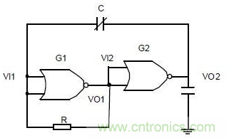 振蕩電路的作用是將電容的變化量轉(zhuǎn)化為頻率可變的方波。由圖3 可知,這是一個(gè)非對(duì)稱多諧振蕩器?;蚍情TG1 工作在電壓傳輸特性的轉(zhuǎn)折區(qū),把它的輸出電壓直接連接到或非門G2 的輸入端。G2即可得到一個(gè)介于高低電平之間的靜態(tài)偏置電壓,從而使G2 的靜態(tài)工作點(diǎn)也處于電壓傳輸特性轉(zhuǎn)折區(qū)上。反饋環(huán)路中電容使電路在兩個(gè)暫穩(wěn)態(tài)之間往復(fù)振蕩。