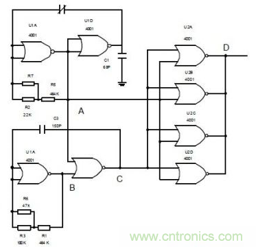 需要指出的是,圖3 所示的濕度傳感器零點(diǎn)電容比較大,靈敏度不夠高,濕度從0%~100%RH,電容的變化量不超過30~50PF。為此,最好將零點(diǎn)電容消除掉,在實(shí)際設(shè)計(jì)中我們用兩片CMOS4001 集成電路對(duì)圖3 進(jìn)行改造,具體見圖4。