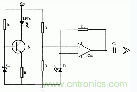 為了使發(fā)光二極管的亮度始終保持一定,由 LED1 、N1 、R0 、ZD1 和R1構(gòu)成恒流源紅外發(fā)射電路,IC 2B,PH,R2~R4構(gòu)成紅外接收電路,信號通過C1耦合輸出。當PH接受到的紅外光能不變時,IC 2B的7腳輸出電平不變,則C1無耦合信號輸出。當由于絲線的擺動而不斷重復地切割紅外光束使PH所接收到的光能改變時,C1耦合輸出相同頻率的脈動信號。見圖1。