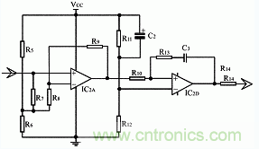 由D1、R15~R18、C6及IC 2C組成,由R18引入正反饋。當前級信號頻率低于一定值F1時,IC 2C的8腳輸出低電平;當前級信號頻率高于一定值F2時,IC 2C的8腳輸出高電平。臨界過渡區(qū)頻率范圍FW=F2-F1,適當?shù)腇W可以有效防止檢測信號臨界過渡區(qū)的輸出振蕩,使得檢測動作可靠。