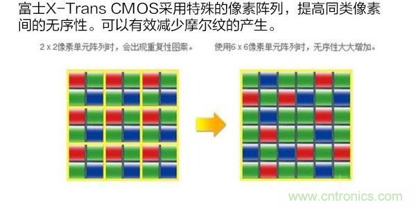 傳統(tǒng)的拜耳陣列傳感器,R/G/B三色的點(diǎn)陣距離相同,因此在拍攝特定密度的規(guī)律物體時(shí),就容易產(chǎn)生摩爾紋。富士的X-Trans CMOS采用了全新色彩濾鏡陣列,降低了傳感器像素間的規(guī)律性,使得像素點(diǎn)本身有類似膠片銀鹽顆粒的不規(guī)則排列效果,從而降低摩爾紋的產(chǎn)生。