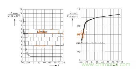 在鋁電解高壓電容器的正常運行過程中,其本身的電解液導電性,將會隨著環(huán)境溫度的降低而降低,從而會導致電解液阻抗的增加,阻抗和損耗角正切也會因此而增大。在絕大多數應用中,相應增加僅允許到某最大值。在這里需要強調的一點是,低于上述溫度限值的工作并不會損壞高壓電容,僅僅只是會影響其使用壽命,尤其是當紋波電流流經器件時,由于增加ESR而產生的熱量耗散會提高電容器溫度,使其遠大于環(huán)境溫度,使電容可維持設備運行。下圖所示為下限類別溫度為-25℃電容器的阻抗和電容典型值。