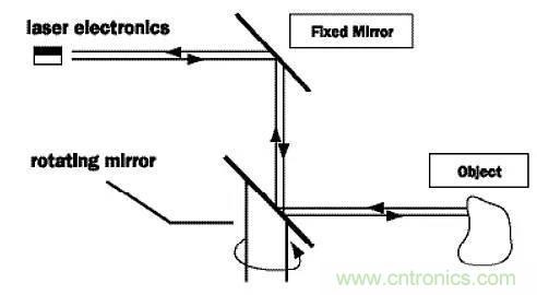 這套發(fā)射/接收組件和旋轉(zhuǎn)鏡面結(jié)合在一起,能掃描至少一個(gè)平面。鏡面不只反射二極管發(fā)出去的光,而且也能把反射回來的光再反射給接收器。通過旋轉(zhuǎn)鏡面,能夠?qū)崿F(xiàn)90到180度的視角,并且大大降低系統(tǒng)設(shè)計(jì)和制造的復(fù)雜度,因?yàn)殓R面是這里面唯一的運(yùn)動機(jī)構(gòu)。