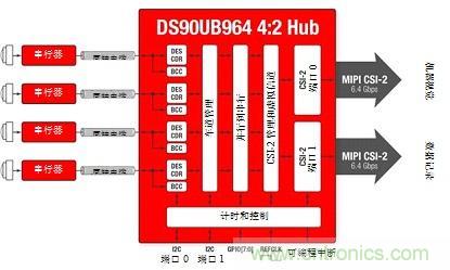 圖3所示為四攝像頭系統(tǒng),具有由彩色塊所示的不同數(shù)據(jù)速率。聚合數(shù)據(jù)在移動工業(yè)處理器接口(MIPI)攝像頭串行接口(CSI)-2端口0和1兩者處呈現(xiàn)。CSI-2總線具有“突發(fā)性”,意味著其以固定數(shù)據(jù)速率運行、將發(fā)送數(shù)據(jù)為可用狀態(tài),并且當(dāng)機器空閑時恢復(fù)到低功率(LP)狀態(tài)。因此,傳感器速度可在不改變ECU處理器時序的條件下進(jìn)行變化。即使傳感器鏈路以獨立頻率運行,解串器集線器在單個參考時鐘上也可將數(shù)據(jù)提供給片上系統(tǒng)(SoC)處理器,從而簡化系統(tǒng)時序。