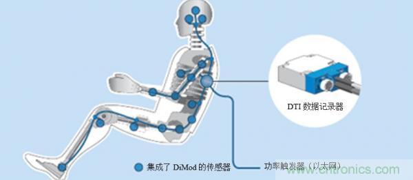 采集好的傳感器數(shù)據(jù)之后會被傳遞給假人體內(nèi)的奇石樂DTI中央數(shù)據(jù)記錄器,再通過以太網(wǎng)繼續(xù)傳給COMBox/KiHUB數(shù)據(jù)接口設(shè)備。車內(nèi)所有DTI系統(tǒng)通過該設(shè)備與中央網(wǎng)絡(luò)相連。這種解決方案的亮點在于:同步數(shù)據(jù)、觸發(fā)測試、供電僅需一根電纜。電纜始于假人,終于車載數(shù)據(jù)采集器。采集器一般通過隨行電纜等與主機(jī)相連。