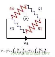 原理圖如上,當壓力變化時,電阻R1,R2,R3,R4發(fā)生變化,從而引發(fā)加載在電阻中間的電壓發(fā)生變化,這種變化反映出壓力值。