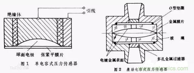 它一般采用圓形金屬薄膜或鍍金屬薄膜作為電容器的一個電極,當薄膜感受壓力而變形時,薄膜與固定電極之間形成的電容量發(fā)生變化,通過測量電路即可輸出與電壓成一定關系的電信號。電容式壓力傳感器屬于極距變化型電容式傳感器,可分為單電容式壓力傳感器和差動電容式壓力傳感器。