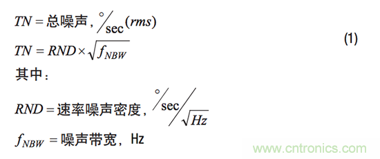傳感器固有噪聲代表的是陀螺儀在靜態(tài)慣性和環(huán)境條件下運(yùn)行時(shí)其輸出中的隨機(jī)振動(dòng)。MEMS IMU數(shù)據(jù)手冊(cè)通常會(huì)提供速率噪聲密度(RND)參數(shù)來描述陀螺儀相對(duì)于頻率的固有噪聲。此參數(shù)通常使用單位°/s/√Hz,是預(yù)測(cè)特定