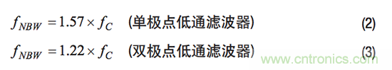 當(dāng)RND的頻率響應(yīng)遵循單極點(diǎn)或雙極點(diǎn)低通濾波器曲線時(shí),噪聲帶寬(fNBW)和濾波器截止頻率(fC)將有公式2和公式3的關(guān)系。
