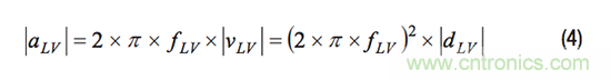 由于陀螺儀用于測(cè)量旋轉(zhuǎn)角速率,因此其對(duì)線性運(yùn)動(dòng)的響應(yīng)會(huì)引入測(cè)量誤差。MEMS IMU數(shù)據(jù)手冊(cè)通常通過“線性加速度對(duì)偏置的影響”或“線性加速度”等參數(shù)來描述對(duì)線性運(yùn)動(dòng)的這一響應(yīng),這些參數(shù)通常使用單位°/s/g。線性振動(dòng)是一種重復(fù)的慣性運(yùn)動(dòng),其幅度大小可通過位移(m)、線性速度(m/s)或線性加速度(m/s2或g)表示。在特定的振動(dòng)頻率(fLV)下,位移(|dLV|)、速度(|vLV|)和加速度(|aLV|)之間的幅度關(guān)系如公式4所示。