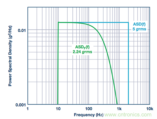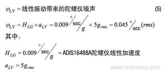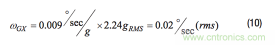 公式10通過線性加速度參數(shù)乘以ASDF (f)曲線幅值2.24 g rms,可估算產(chǎn)生的噪聲電平為0.02°/s (rms)。此噪聲電平比通過公式5得到的0.045°/s (rms)低55%,公式5的方法未采用頻譜項(xiàng)評(píng)估此噪聲源。這種改善是采用頻譜項(xiàng)定義振動(dòng)曲線以獲取值的一個(gè)示例。