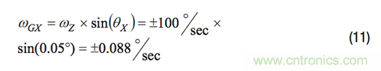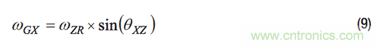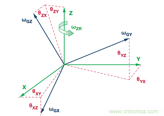 每個(gè)陀螺儀的對(duì)齊誤差均具有兩個(gè)分量,分別定義其相對(duì)于慣性參考系中另一個(gè)軸的對(duì)齊誤差。例如,對(duì)于圖2中的系統(tǒng),θXZ代表x軸陀螺儀相對(duì)于z軸的對(duì)齊誤差。此對(duì)齊誤差定義有助于建立公式以計(jì)算離軸陀螺儀對(duì)系統(tǒng)慣性參考系中圍繞另一個(gè)軸旋轉(zhuǎn)運(yùn)動(dòng)的響應(yīng)。公式9中給出了一個(gè)示例,其量化了x軸陀螺儀相對(duì)于z軸的對(duì)齊誤差(θXZ)和圍繞z軸旋轉(zhuǎn)(ωZR)而產(chǎn)生的響應(yīng)(ωGX)。