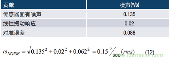 表1總結(jié)了ADIS16488A中來自各個(gè)因素的陀螺儀噪聲。公式12給出了0.15°/s (rms)的整體噪聲估算值(ωNOISE),表示表1中所有三個(gè)噪聲源的平方和根值(RSS)。