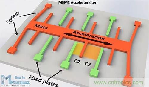 通用 MEMS 感應(yīng)技術(shù)是使用片載可變電容器。在運(yùn)動(dòng)中,綠色的固定板保持靜止,而橙色的重物沿加速度軸彎曲。通過(guò)這種運(yùn)動(dòng),電容值 C1 和 C2 會(huì)隨著固定板與重物之間距離的變化而變化。