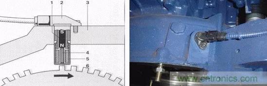 1、永磁鐵 2、傳感器殼體 3、發(fā)動機外蓋 4、軟鐵芯 5、線圈 6、傳感線圈