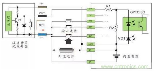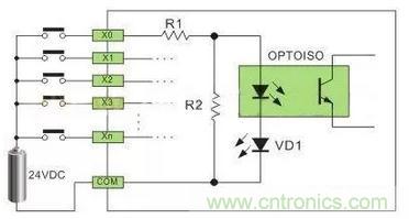 PLC 的數(shù)字量輸入接口并不復(fù)雜,PLC 為了提高抗干擾能力,輸入接口都采用光電耦合器來(lái)隔離輸入信號(hào)與內(nèi)部處理電路的傳輸。因此,輸入端的信號(hào)只是驅(qū)動(dòng)光電耦合器的內(nèi)部 LED 導(dǎo)通,被光電耦合器的光電管接收,即可使外部輸入信號(hào)可靠傳輸。