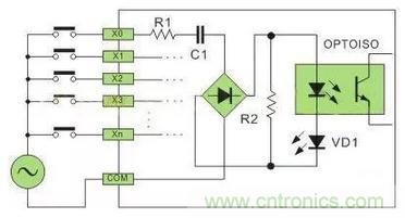 直流電可以由PLC內(nèi)部提供也可以外接直流電源提供給外部輸入信號(hào)的元件。R2在電路中的作用是旁路光電耦合器內(nèi)部LED的電流,保證光電耦合器LED不被兩線(xiàn)制接近開(kāi)關(guān)的靜態(tài)泄漏電流導(dǎo)通。