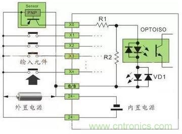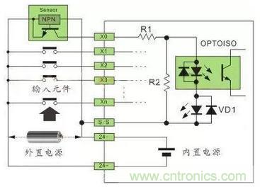 注:24VDC供電的傳感器,在輸入回路上需要串聯(lián)限流電阻,R1為10Ω,R2為2KΩ,不串聯(lián)限流電阻,將燒毀接口回路,限流電阻取值2.7KΩ。