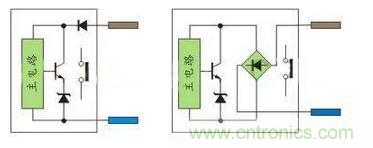 直流兩線(xiàn)制接近開(kāi)關(guān)分二極管極性保護(hù)與橋整流極性保護(hù),前者在接PLC時(shí)需要注意極性,后者就不需要注意極性。有源舌簧磁性開(kāi)關(guān)主要用在汽缸上做位置檢測(cè),由于需要信號(hào)指示,內(nèi)部有雙向二極管回路,因此也不需要注意極性;交流兩線(xiàn)制接近開(kāi)關(guān)就不需要注意極性。如圖10: