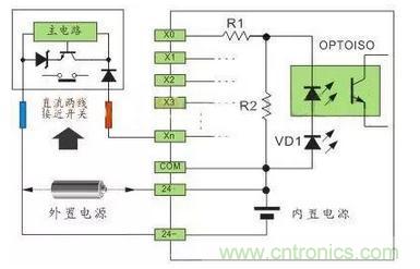 如圖1,直流輸入電路要求外部輸入信號(hào)的元件為無(wú)源的干接點(diǎn)或直流有源的無(wú)觸點(diǎn)開(kāi)關(guān)接點(diǎn),當(dāng)外部輸入元件與電源正極導(dǎo)通,電流通過(guò)R1,光電耦合器內(nèi)部LED,VD1(接口指示)到COM端形成回路,光電耦合器內(nèi)部接收管接受外部元件導(dǎo)通的信號(hào),傳輸?shù)絻?nèi)部處理;這種由直流電提供電源的接口方式,叫直流輸入電路;
