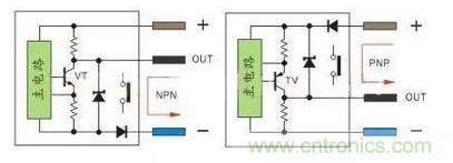PNP型當(dāng)傳感器有檢測(cè)信號(hào)VT導(dǎo)通,正極的電流流向輸出端OUT,輸出端OUT電位接近正極,通常說(shuō)的低電平翻轉(zhuǎn)成高電平。