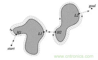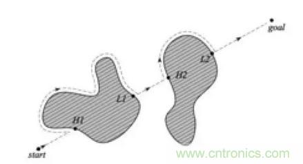 Bug算法應該是最簡單的一種避障算法了,它的基本思想是在發(fā)現(xiàn)障礙后,圍著檢測到的障礙物輪廓行走,從而繞開它。Bug算法目前有很多變種, 比如Bug1算法,機器人首先完全地圍繞物體,然后從距目標最短距離的點離開。Bug1算法的效率很低,但可以保證機器人達到目標。