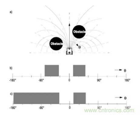 圖中x軸是以機器人為中心感知到的障礙物的角度,y軸表示在該方向存在障礙物的概率大小p。實際應用的過程中會根據(jù)這個直方圖首先辨識出允許機器人通過的足夠大的所有空隙,然后對所有這些空隙計算其代價函數(shù),最終選擇具有最低代價函數(shù)的通路通過。