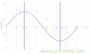 圖1:單軸加速度傳感器360°旋轉(zhuǎn)對(duì)應(yīng)輸出