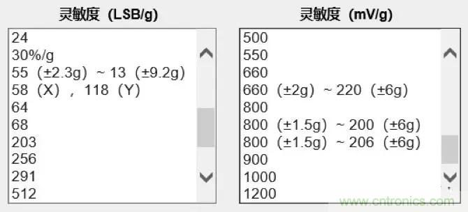 靈敏度(LSB/g)主要針對(duì)數(shù)字輸出加速度傳感器,代表一個(gè)重力加速度(g)下,輸出能區(qū)分多少位LSB。上面已經(jīng)根據(jù)應(yīng)用要求推導(dǎo)出,假設(shè)應(yīng)用要求最小分辨率為1°,靈敏度需要大于58LSB/g。那么可以根據(jù)這一結(jié)果直接在參數(shù)欄里選擇。