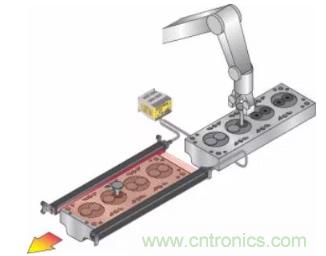 在流程的下一步驟之前驗證關鍵部件是否到位并處于正確位置是一項常見要求。光電傳感器可以輕松實現(xiàn)這一目標,最新型號甚至可以檢測零件的最小和最窄邊緣。在圖示中,兩個傳感器可以形成僅為百分之一英寸的會聚點,以精確地檢測半導體晶片的邊緣。在該示例中,傳感器不僅驗證晶片的存在,而且還可以檢測晶片是否在盒中傾斜。