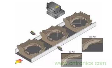 隨著過去幾年傳感技術的進步,用戶現(xiàn)在能夠將具有成本效益的測量功能集成到他們的工藝中,分辨率高達0.0001英寸。在下一個制造步驟之前,可以自動檢查零件的關鍵屬性。在圖示中,激光傳感器檢查在夾具中旋轉的鑄造輪,以確保在加工之前沒有空隙或過多的跳動。