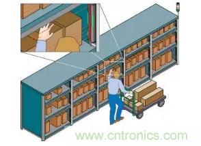 順序手動裝配中人的準確性也是防錯的一個大問題。PLC控制的“揀選”系統(tǒng)使用指示下一個要選擇的項目的燈,以及每個箱前面的光幕來驗證是否已經采取了正確的部件。這些系統(tǒng)通過減少錯過的零件以及以錯誤順序組裝的零件來提高裝配操作的質量百分比。除了裝配過程的防錯之外,它們還通過在裝配過程中始終驗證裝配工最后停止的位置來提高工人效率,即使在休息或停工之后也是如此。這種完全可視化的通信系統(tǒng)也是一種全球解決方案,可消除語言障礙和技術能力等培訓障礙。該圖顯示了倉庫應用程序。