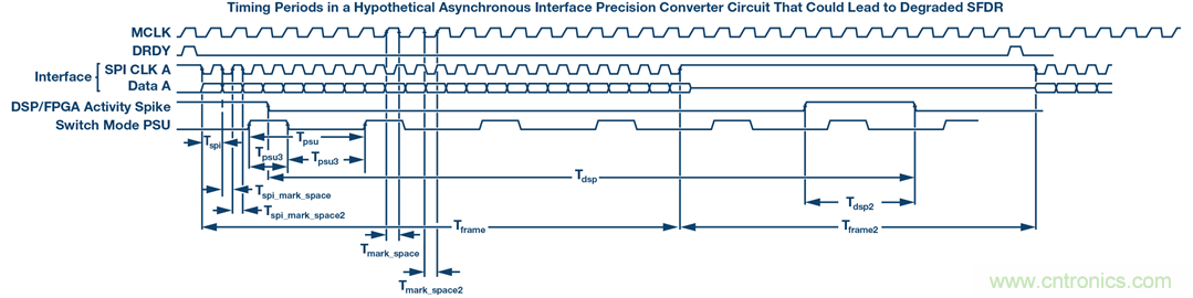 在圖15中,標(biāo)記了各種定時(shí)周期,這很容易干擾SFDR或?qū)е露秳?dòng)。如果SPI通信未頻鎖到MCLK,則可能發(fā)生雜散。掌握布局技術(shù)是您緩解此問題的最大保障。頻率表現(xiàn)為混疊下行干擾源,但也作為拍頻和交調(diào)產(chǎn)物。例如,如果SPI在16.01 MHz下運(yùn)行,MCLK在16 MHz下運(yùn)行,則應(yīng)在10 kHz下發(fā)生雜散。