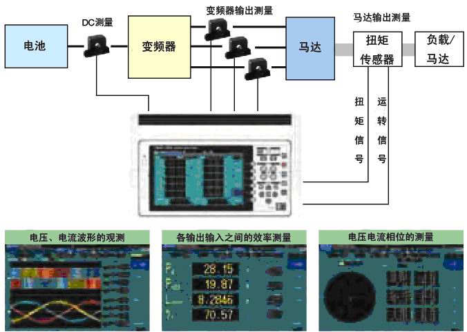 在強化新能源相關(guān)系統(tǒng)的開發(fā)和設(shè)備的節(jié)能化的進程中,針對功率測量方面的要求涉及許多方面。圖1是變頻器馬達測量的典型例子,而且最近的動向和測量需求的主要方面,可列舉出以下事項: