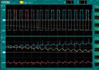 此外,3390還具備以X-Y圖表顯示來確認變頻器的動態(tài)特性的功能,變頻器不可或缺的諧波測量功能,用FFT評估影響變頻器的干擾的功能(可達100kHz)等(圖2)。而且,利用3390的500k采樣/秒的高速采樣率,來顯示電壓/電流波形(圖3)。之前,需要使用數(shù)字示波器和差分探頭、鉗式電流傳感器來觀測波形,非常麻煩,現(xiàn)在1臺3390即可實現(xiàn)。